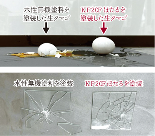 「KF20Fほたる」は、生タマゴに塗装して高さ3mから落下させても割れません。また、ガラス板に塗装してハンマーで割っても飛び散らないといった強さと柔らかさを兼ね備えています。