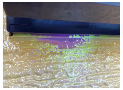 プラックライトを当てると紫色の部分が塗装されていない部分(塗り漏れを想定)蛍光色部分が塗装されている状況。