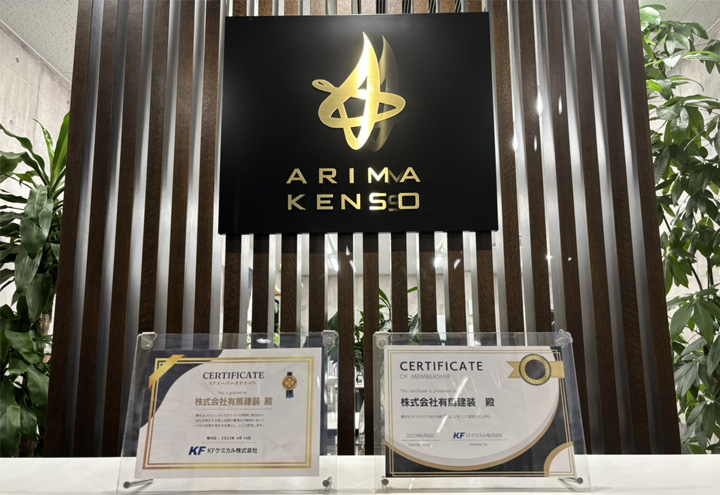 有馬建装では、信頼性と耐久性に優れたKFケミカル株式会社の塗料を使用しています。 グループ的なつながりを持つことで、常に最新の塗料技術や情報を取り入れ、より高品質な施工をご提供。現代の塗料は進化しており、塗膜の長期保証も10年、あるいは20年という時代を迎えています。 私たちはこの時代の要求に応える確かな施工技術と、長期にわたる美しさと安心が続く塗装をお客様にお届けいたします。