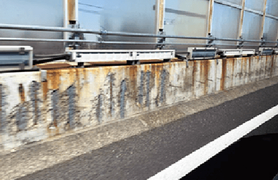 首都高速道路の壁高欄が建設から約60年経過し、老朽化が進みコンクリート片が一部剥落。